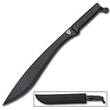 This monster machete is equipped with a 13 1/2 kukhri style blade with black baked finish. The impact resistant handle is thick and rugged for a tight, no-slip grip. Includes heavy-duty nylon sheath. 19 overall